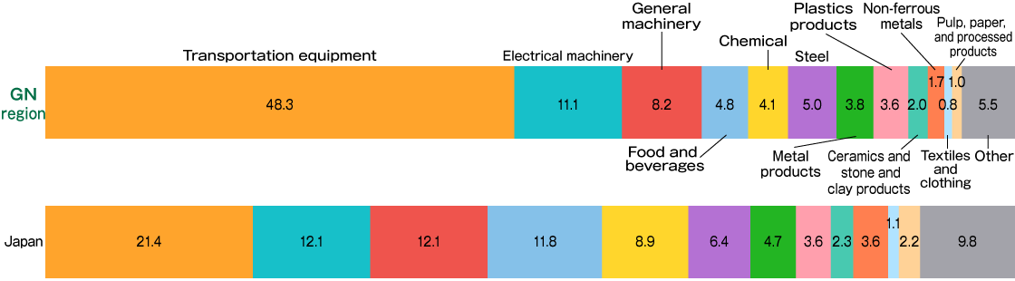 Despite possessing only about 10% of Japan’s area and population, the Greater Nagoya Area is Japan’s leading manufacturing region with a cluster of manufacturing companies that lead the world in a wide range of fields, including transportation equipment, electronic parts, materials, industrial equipment, medicine, and ceramics.
