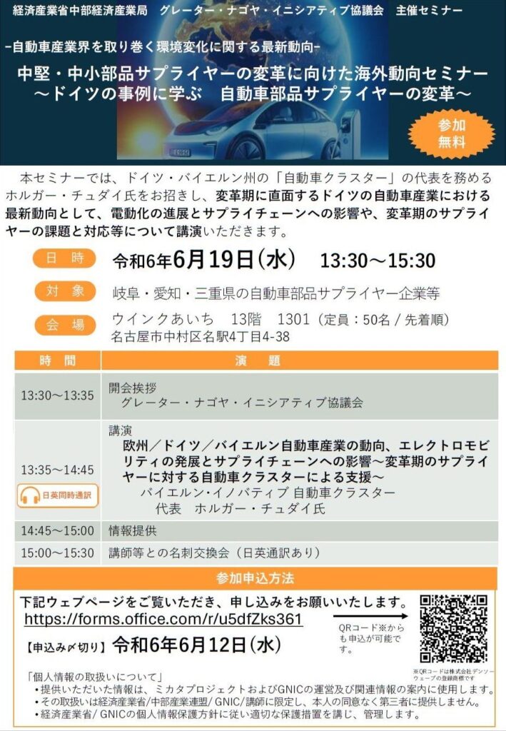 この度、グレーター・ナゴヤ・イニシアティブ協議会では、変革に立ち向かう中堅・中小の自動車部品サプライヤー企業の取組の参考・きっかけとしていただけるよう、中部地域と同様に自動車産業が集積し変革期に直面するドイツの自動車産業における最新動向に係るセミナーを開催いたします。電動化の進展とサプライチェーンへの影響や、変革期のサプライヤーの課題と対応等について、ドイツ・バイエルン州の自動車クラスターの代表にご講演いただきますので、ご関心のある方はぜひご参加ください!