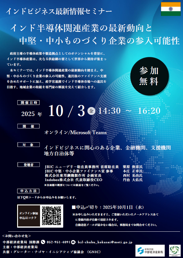本セミナーでは、インド半導体関連産業の最新動向を踏まえ、中堅・中小ものづくり企業の参入の可能性、進出後のファイナンス支援を含めたサポートに加え、産学官連携でインド半導体市場への進出を目指す、地域企業の取組を専門家の解説を交えて紹介します。ぜひご参加ください!
