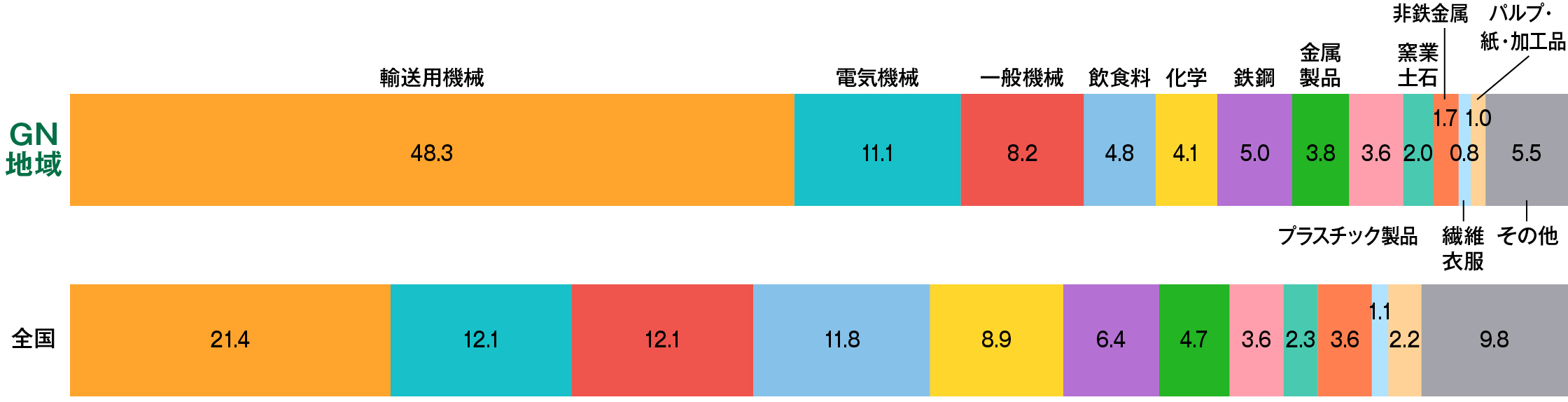 グレーター・ナゴヤは、面積、人口では全国の1割程度であるものの、輸送用機器、電子部品、素材、産業機械、